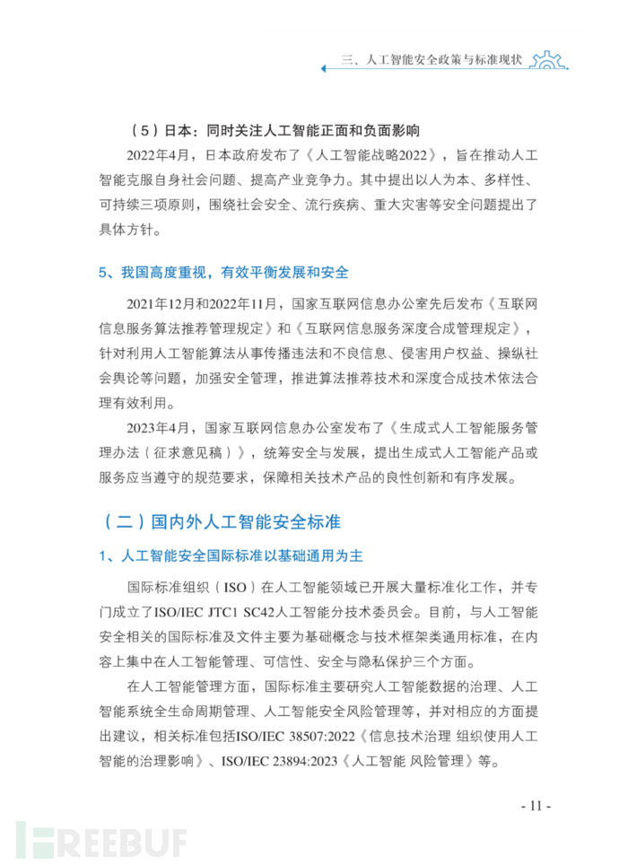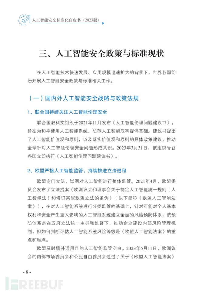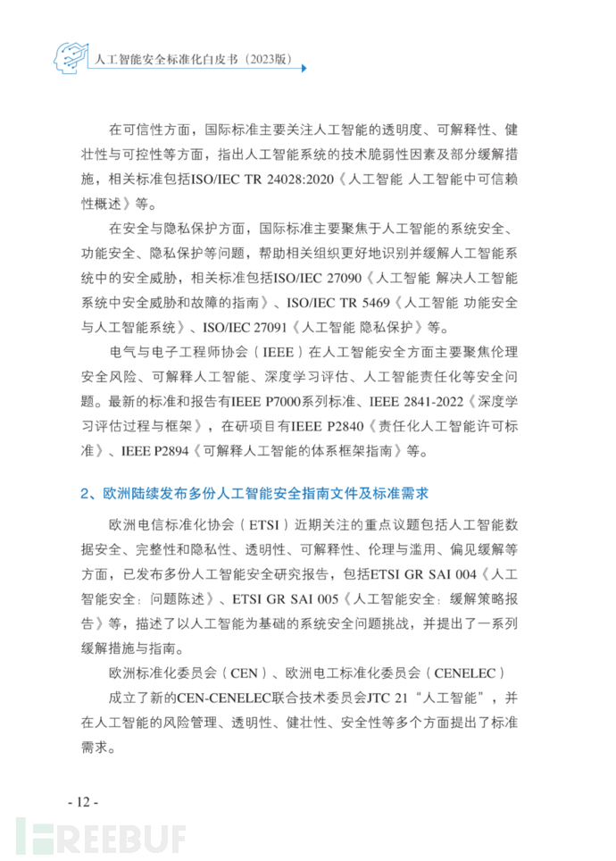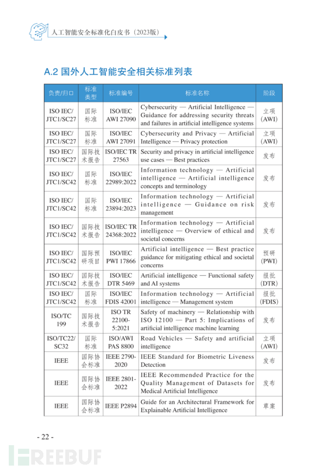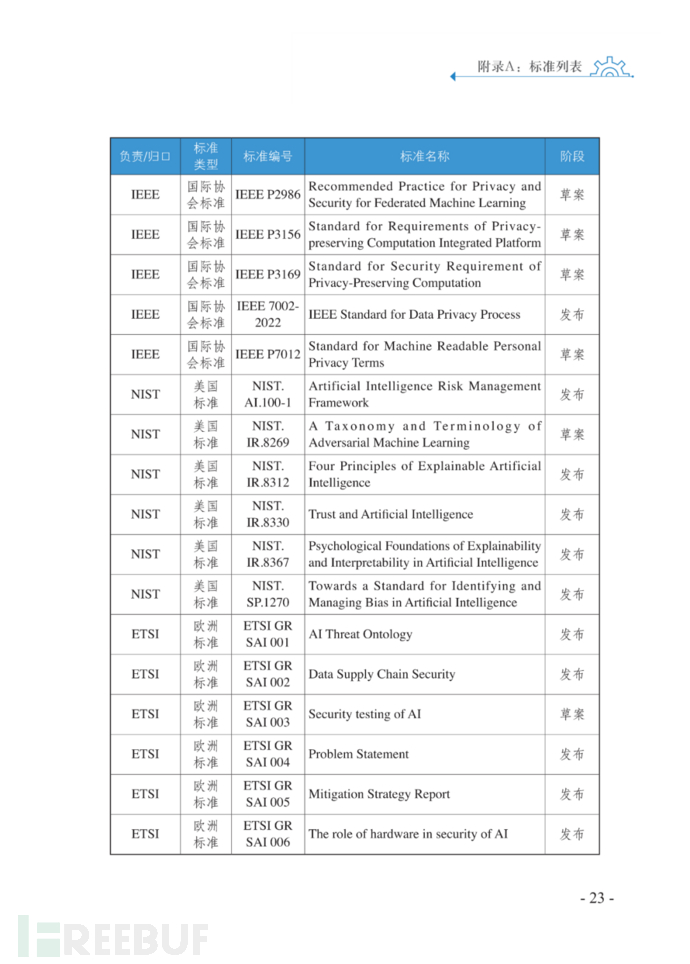 2023年5月29日,在全国信息安全标准化技术委员会2023年第一次标准周“人工智能安全与标准研讨会”上,信安标委大数据安全标准特别工作组发布《人工智能安全标准化白皮书(2023版)》。白皮书由中国电子技术标准化研究院等20家单位共同编写,梳理了人工智能技术与应用发展现状,分析了人工智能面临的新的安全风险,结合国内外人工智能安全政策与标准现状,指出了人工智能安全标准需求,提出了下一步开展人工智能安全标准化工作的建议,为规范引导人工智能安全标准化工作提供参考。