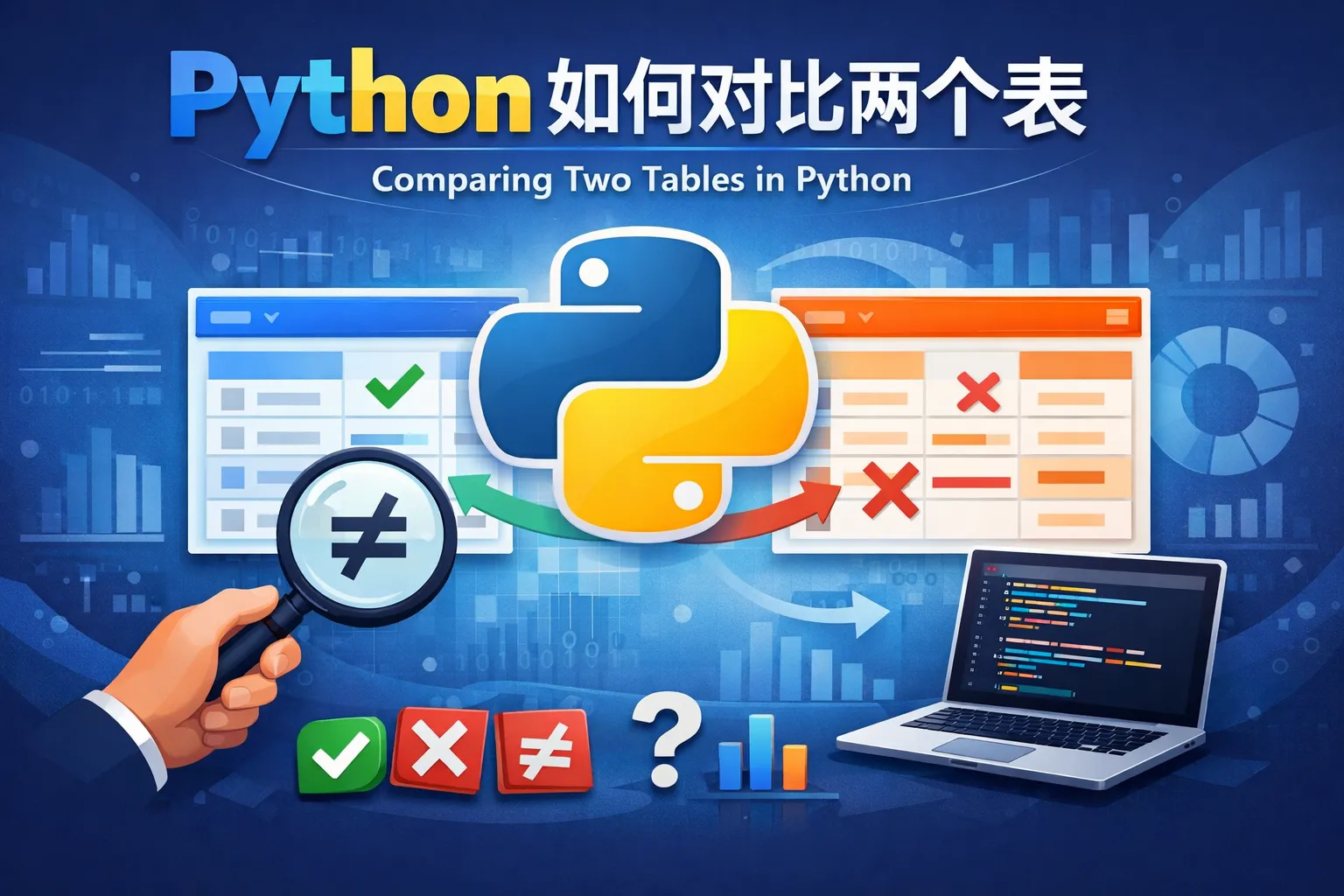 通过Pandas的merge函数,可以使用不同的连接方式(inner、left、right、outer)对比两个表的行数据。结合参数indicator=True,可以标注每条数据的来源,从而识别新增、删除和共有的行。