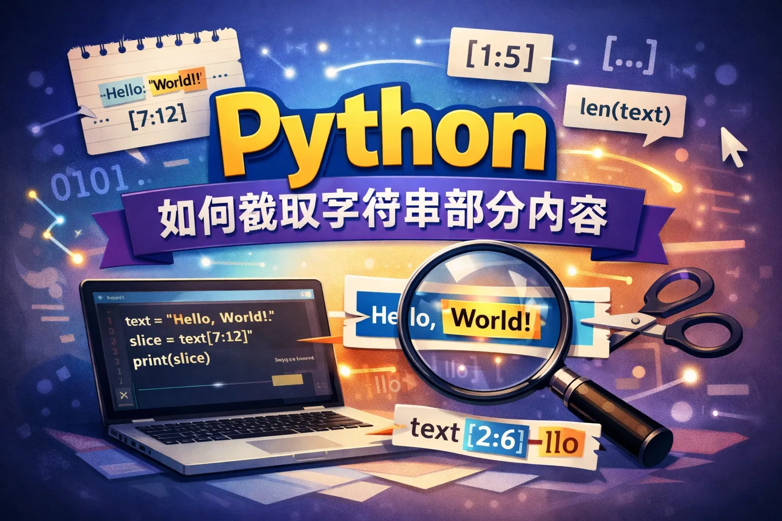 Python中可以通过切片(slice)操作来截取字符串的部分内容。语法为字符串变量[start:end],其中start是起始索引(包含),end是结束索引(不包含)。例如str[2:7]会取出字符串从索引2到索引6的内容。