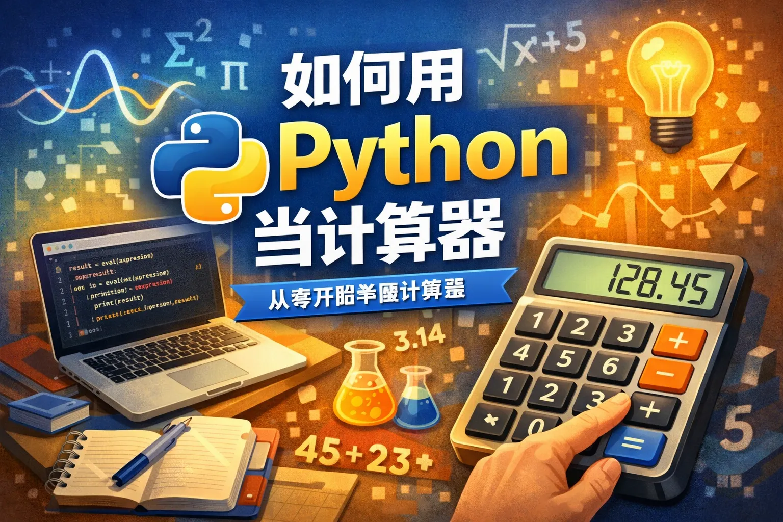 可以通过input()函数获取用户输入的表达式字符串,然后利用内置的eval()函数计算表达式结果。需要注意eval()执行用户输入有安全风险,适合简单练习。示例代码: