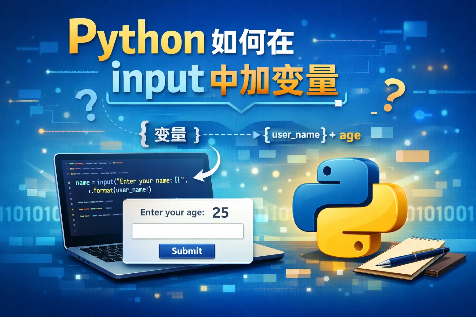 可以通过字符串格式化将变量值插入到input的提示字符串中。例如,使用f字符串:name = '张三'; input(f"请输入{name}的年龄:"),这样提示就会显示“请输入张三的年龄:”。