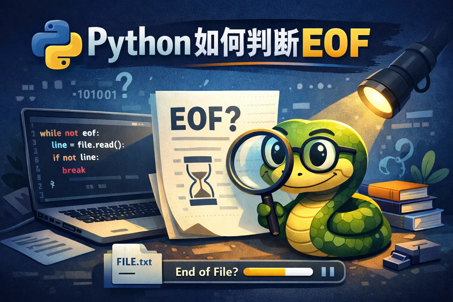可以使用while循环结合read()或readline()方法判断是否返回空字符串。当没有更多数据时,返回空字符串表明EOF。同时也可使用try-except结构捕获可能的异常来处理意外的结束。