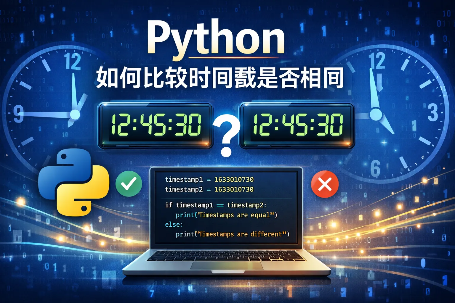 时间戳本质上是浮点数(或者整数),表示距1970年1月1日的秒数。直接使用==操作符比较两个时间戳,如果数值相等,则表示时间相同。示例如下: