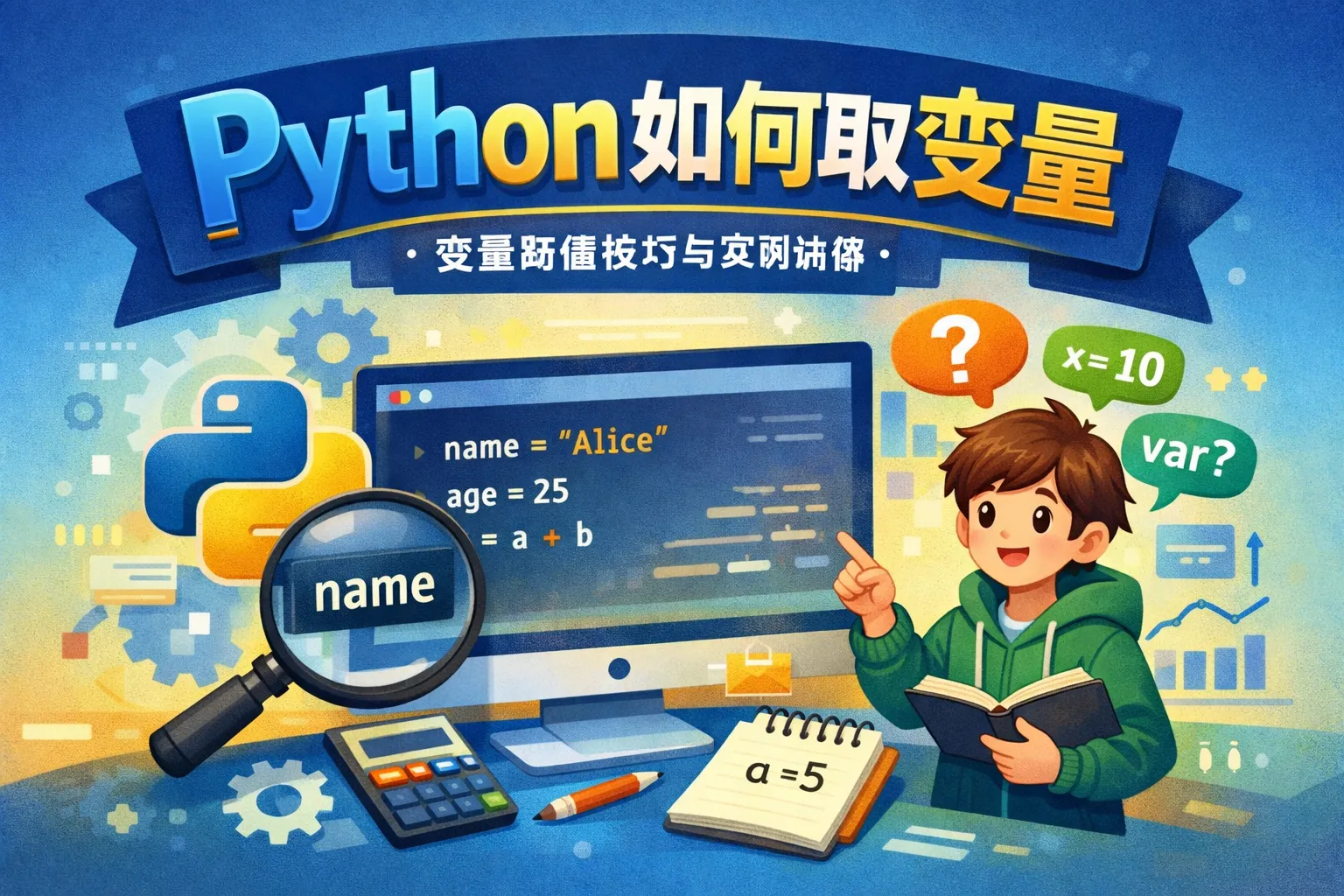 在Python中,变量不需要声明类型,直接使用“变量名 = 值”的形式赋值即可。变量名必须以字母或下划线开头,后续可以包含字母、数字和下划线,不能使用Python的保留关键词。同时,变量名区分大小写,建议使用有意义的名称以提高代码可读性。
