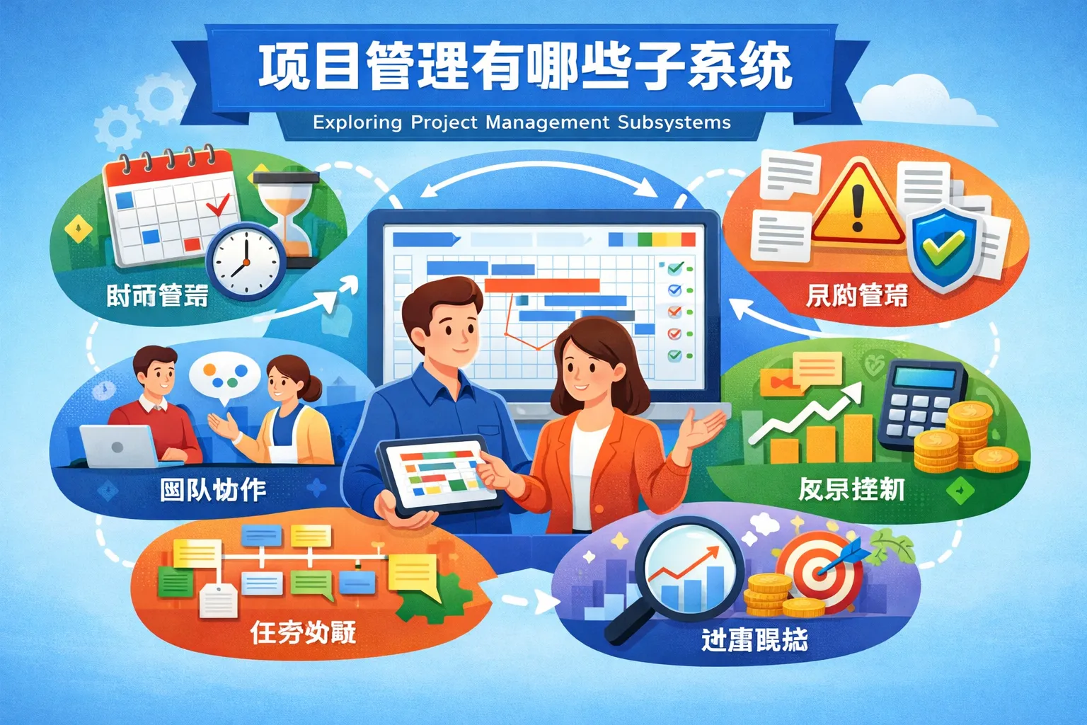项目管理一般包括多个子系统,如进度管理、成本管理、质量管理、风险管理、沟通管理、采购管理和人力资源管理等。这些子系统协同工作,确保项目目标的实现和资源的有效利用。
