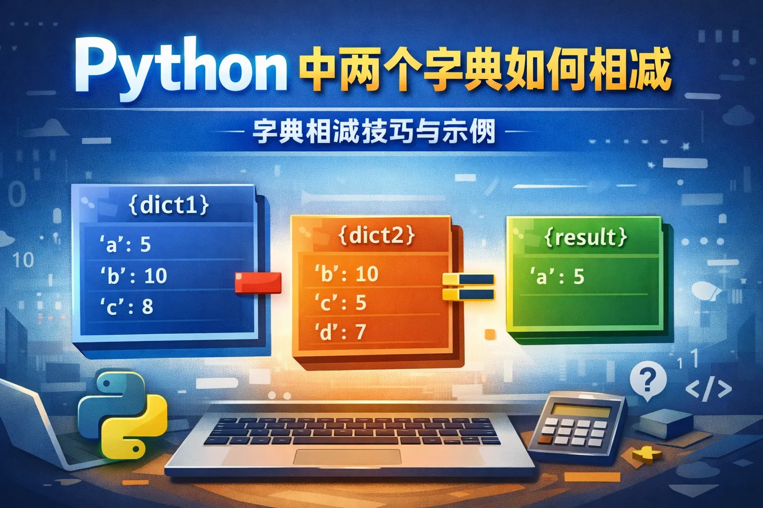 标准的Python字典对象并不支持直接的减法操作,也没有内置方法用于直接“减去”另一个字典。需要结合字典推导式、自定义函数或者使用第三方库如dictdiffer来实现类似功能。