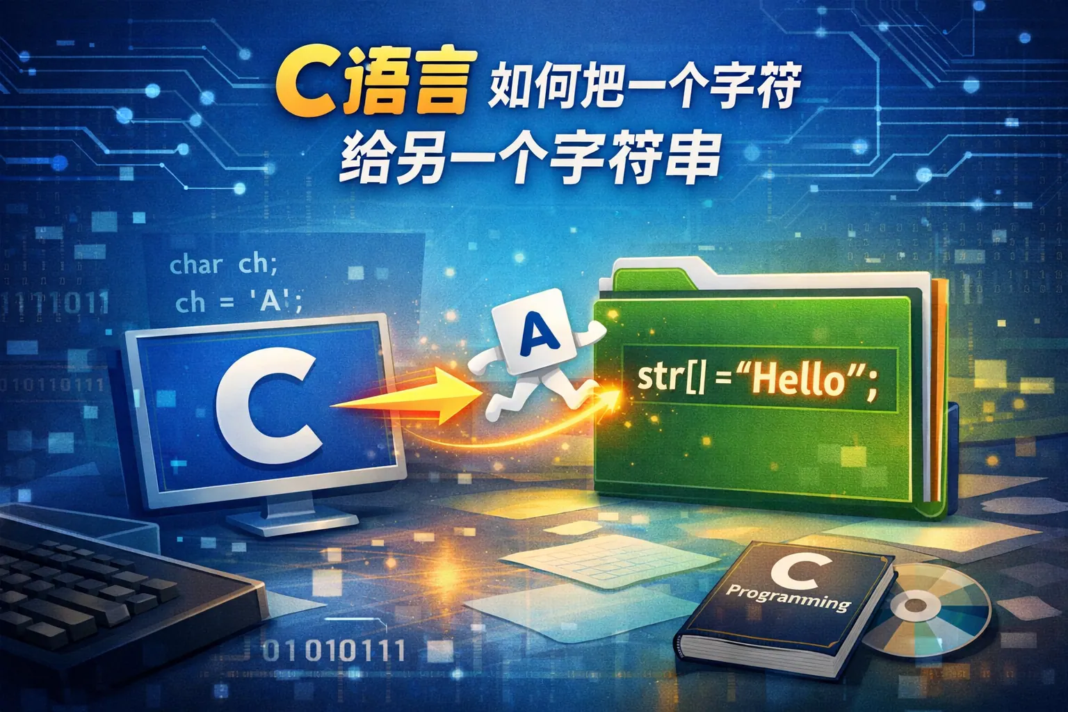 在C语言中,字符串是以空字符('\0')结尾的字符数组。要在字符串末尾添加字符,首先需要找到字符串的长度,然后将该字符赋值给字符串末尾索引的位置,最后在后面加上空字符。例如: