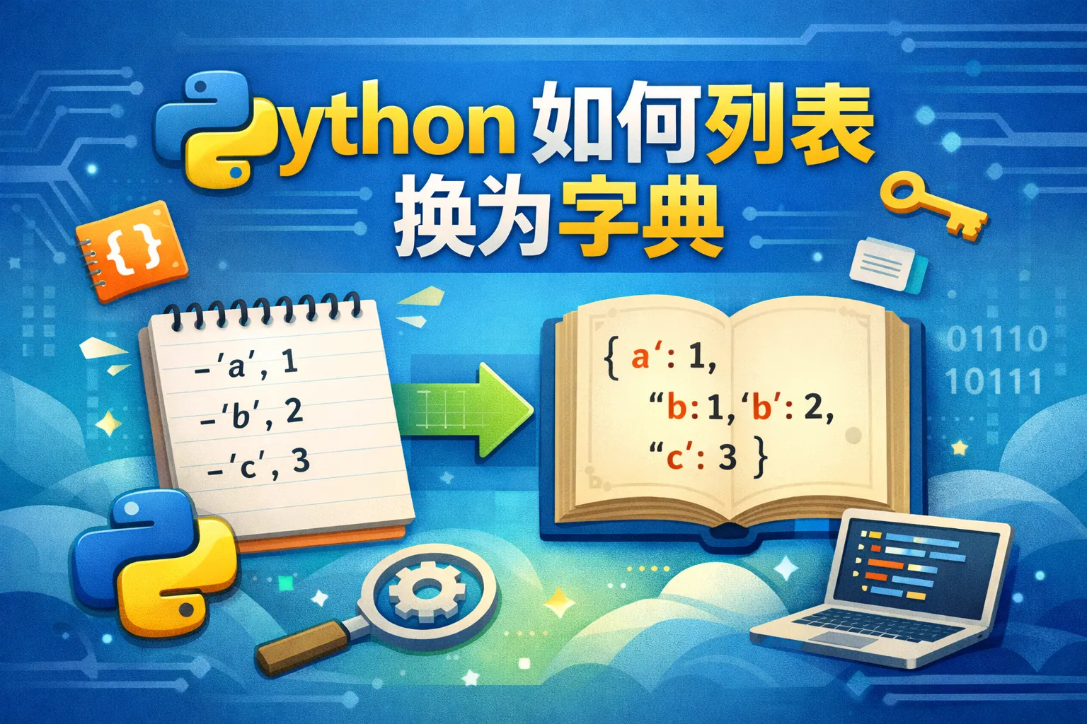Python的zip()函数可以将两个列表按对应位置组合成键值对,之后使用dict()函数将这些键值对集合转换为字典。示例如:dict(zip(keys_list, values_list))
