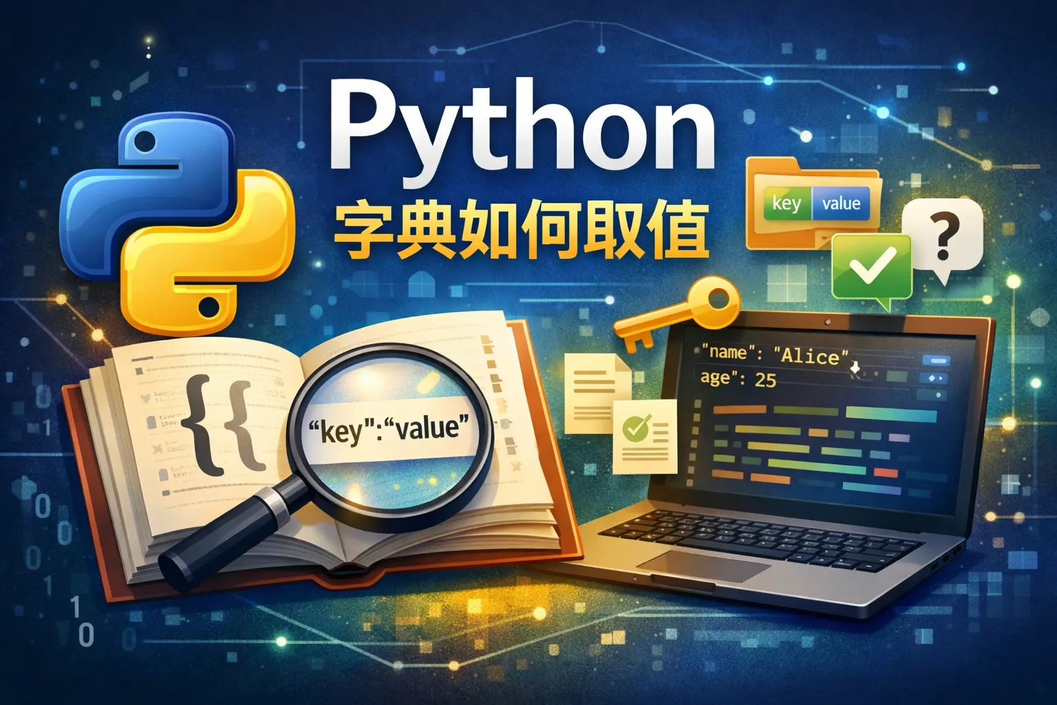 在 Python 中,可以使用字典名[key] 的方式获取对应值,但如果键不存在会引发 KeyError。为了避免这个问题,可以使用字典的 get() 方法,比如 dict.get(key, 默认值),当键不存在时返回默认值而不报错。