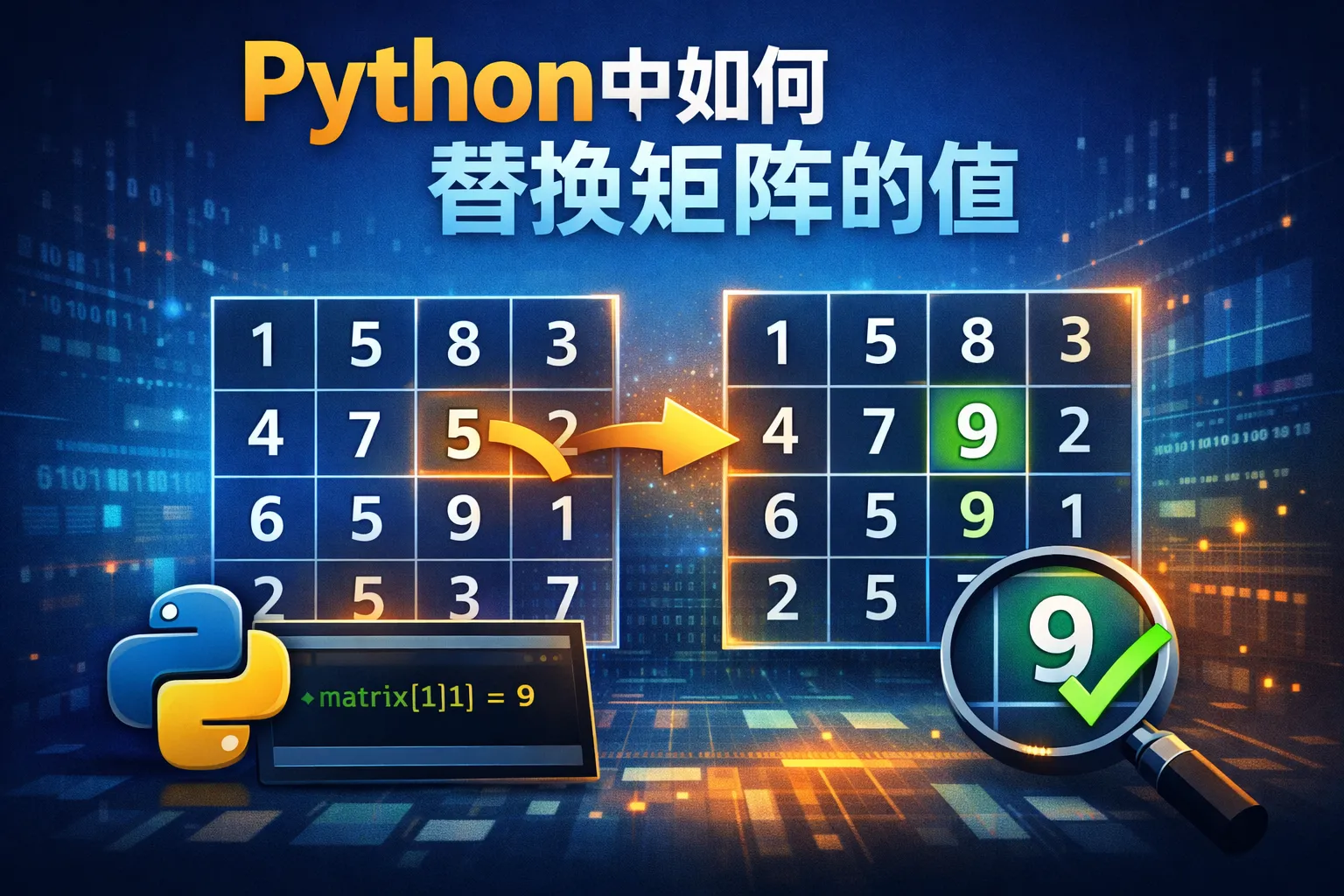 可以借助布尔索引实现替换。比如在NumPy矩阵中,用matrix[matrix == old_value] = new_value,就能将所有等于old_value的元素替换为new_value。