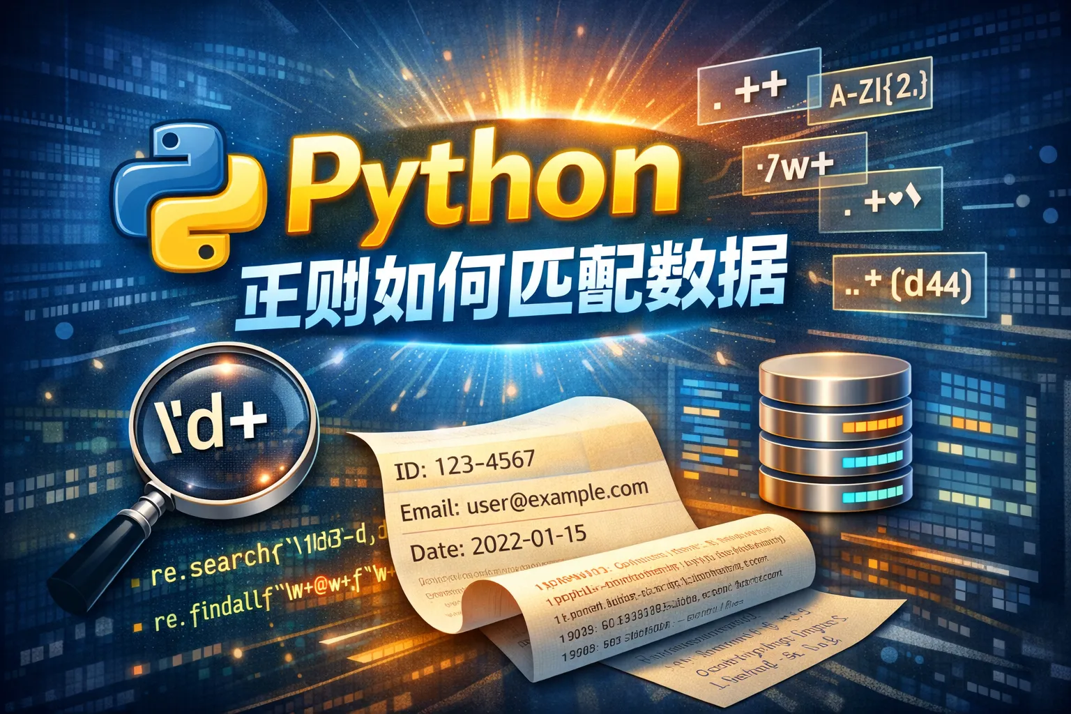 Python的正则表达式模块是re,常用的匹配符包括.匹配任意字符,*表示前面的字符重复零次或多次,+表示一次或多次,?表示零次或一次,\d匹配数字,\w匹配字母数字下划线,\s匹配空白字符。通过组合这些基本元素,可以构建复杂的匹配模式。