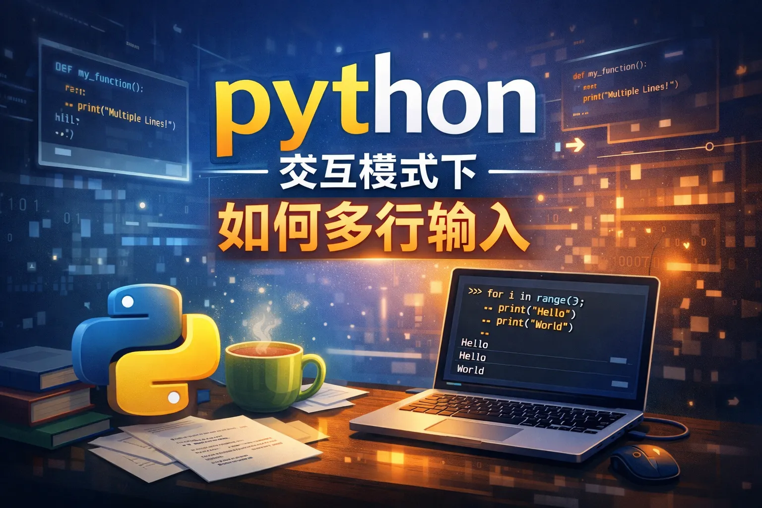 在Python交互模式下,当输入代码块时,直到代码结构完整且语法正确,解释器会保持续行状态。只需在最后一行代码完成后按回车,再输入一个空行按回车,Python会执行整段多行代码,无需额外命令或操作。