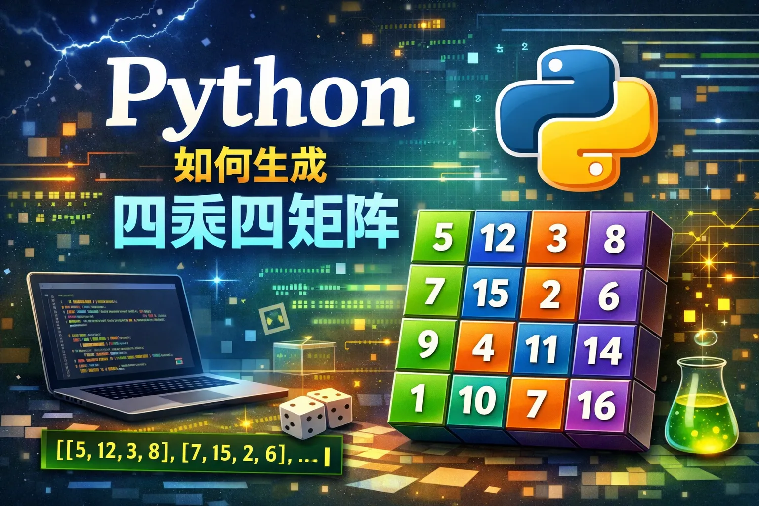 可以通过列表推导式实现,例如:matrix = [[0 for _ in range(4)] for _ in range(4)],这段代码生成了一个4x4的矩阵,矩阵里的元素均为0。
