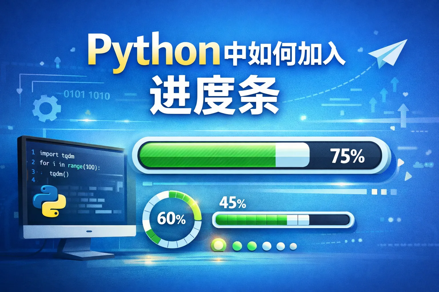 可以使用Python的tqdm库来快速添加进度条。只需安装tqdm(pip install tqdm),然后在迭代对象外层包裹tqdm(),例如: