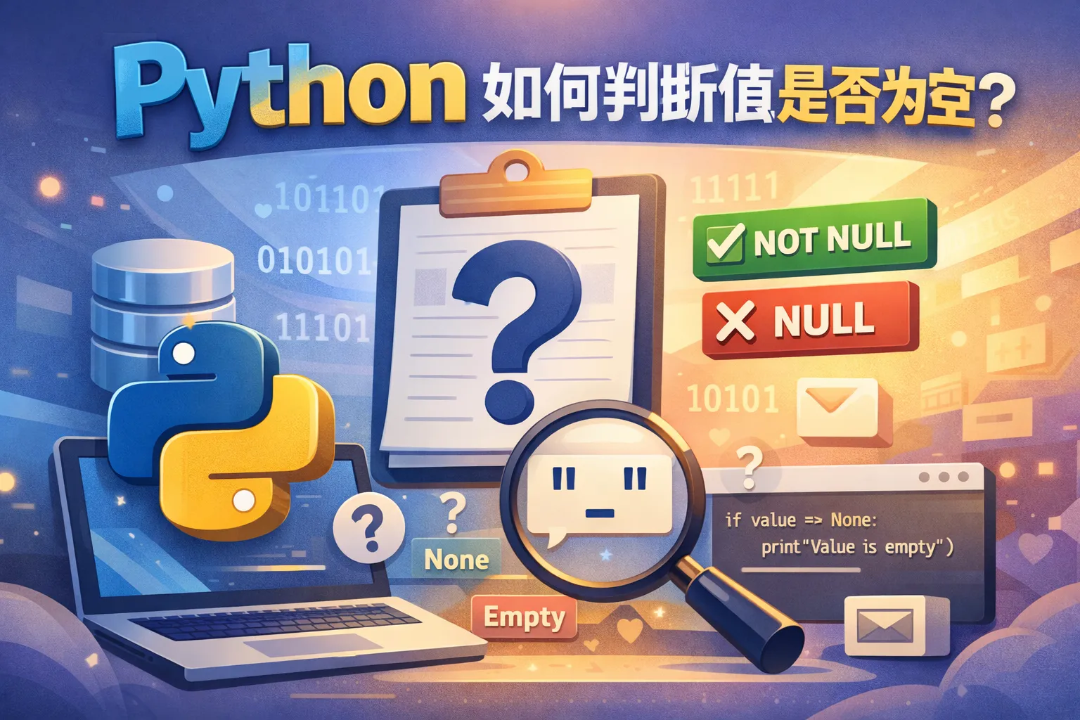 None是Python中的一个特殊常量,表示‘无值’或‘空值’。空值可能指空字符串(‘’),空列表([]),空字典({})等容器类型不包含任何元素。判断是否为None可以使用变量 is None,而判断是否为空则通常用 if not variable 或 len(variable) == 0。不同的应用场景需根据具体类型选择合适的判断方式。