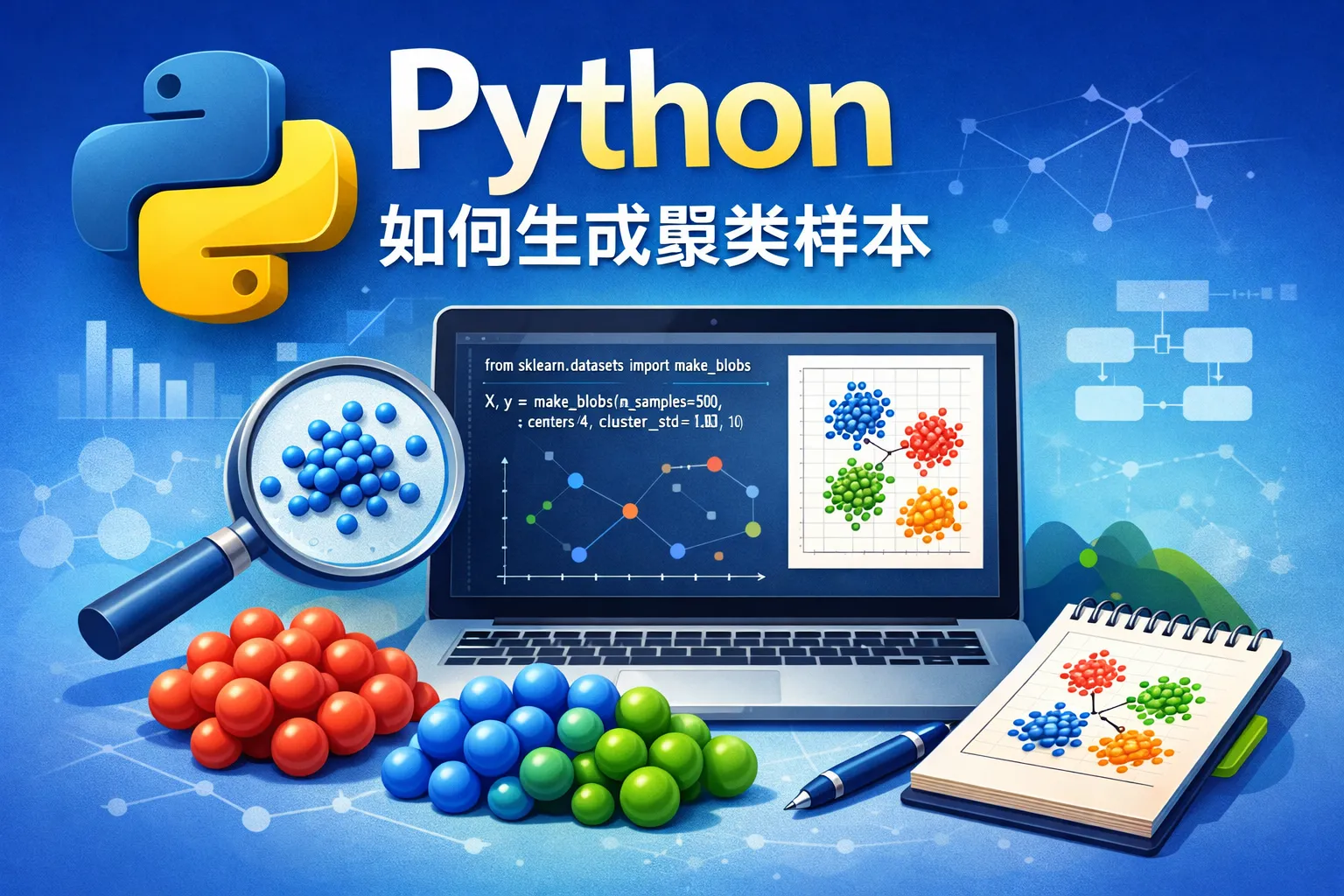 我刚开始学习聚类分析,想用Python生成一些聚类数据样本来练习。需要了解具体操作流程和关键函数。