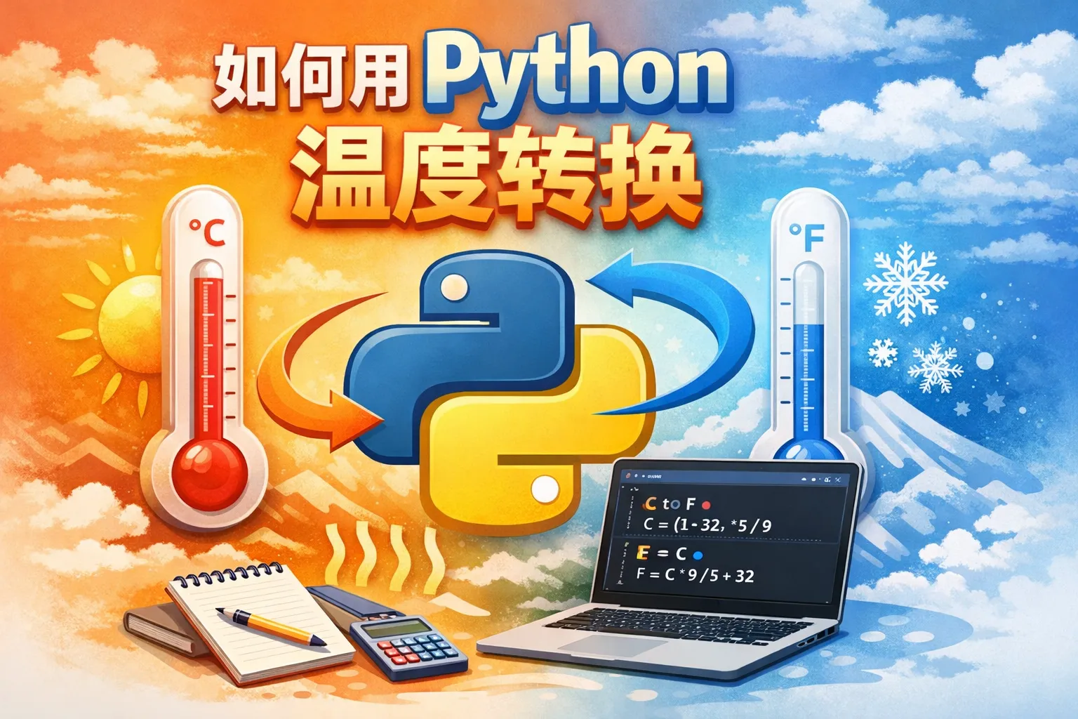 华氏度转换摄氏度的公式为°C = (°F - 32) × 5/9。使用Python编写函数,可以方便完成转换: