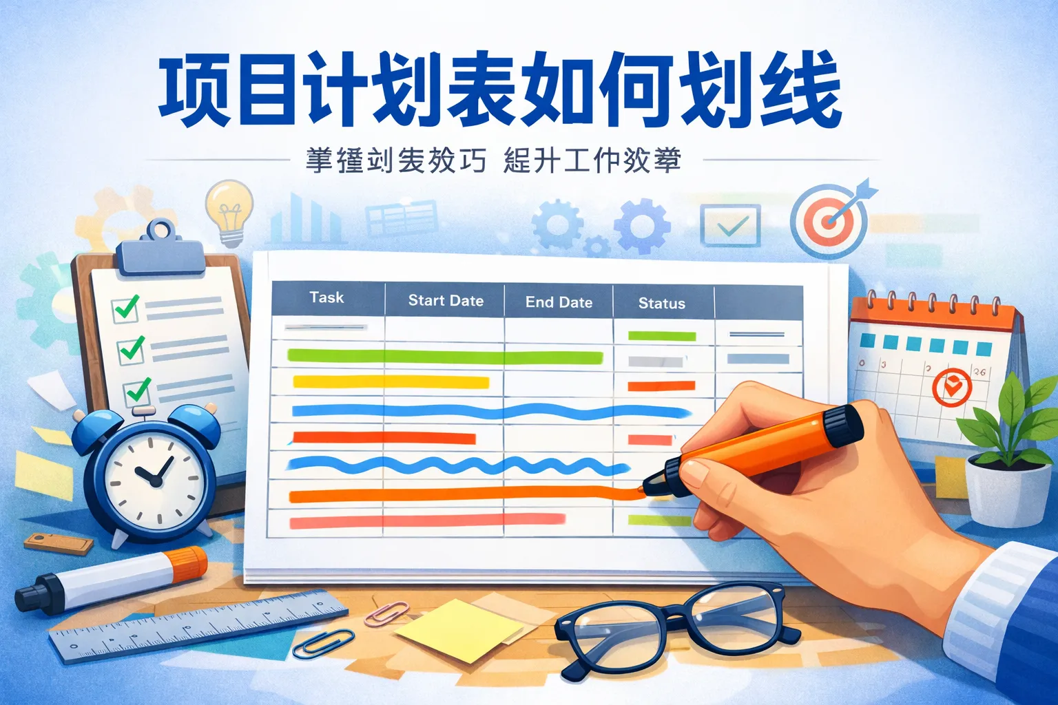 在项目计划表中,可以用横线或条形图的形式标示任务的开始和结束时间,以直观展现任务周期。通常通过绘制从开始日期到结束日期的线条来表示任务时长,这样能够帮助团队成员了解每个任务的时间安排。