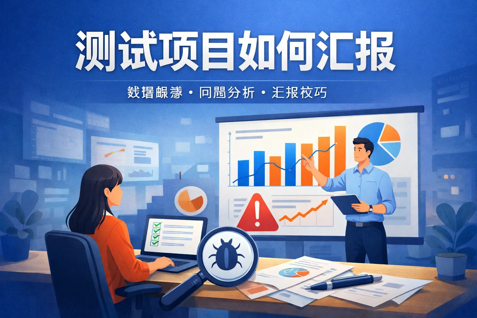 测试项目汇报应覆盖测试目标、测试范围、执行过程、发现的问题、解决方案及测试结果数据。重点突出发现的主要缺陷及其风险评估,同时展示测试覆盖率和未解决问题,确保决策者能够全面了解项目状态和潜在风险。