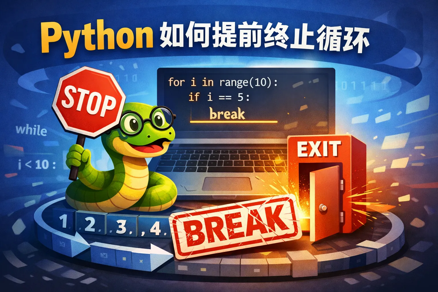 Python提供了break语句,允许程序在循环过程中遇到特定条件时,立即跳出当前循环,无论是for循环还是while循环,都可以使用break来提前终止。