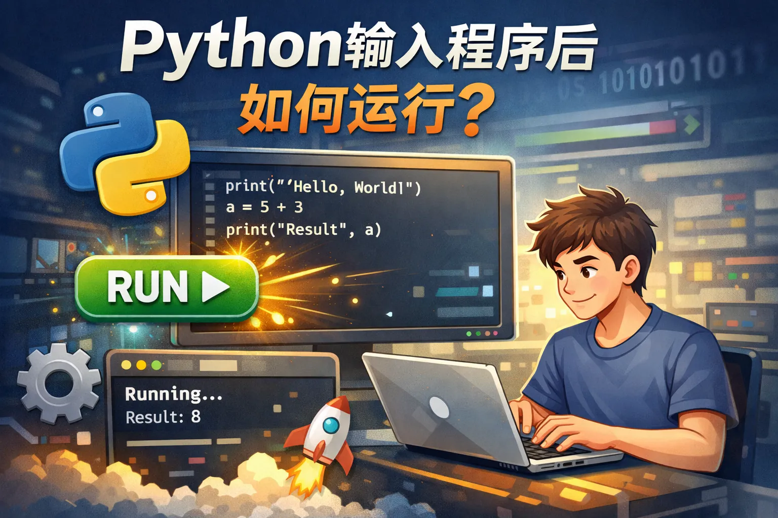 Python自带交互式解释器,您只需打开命令提示符或终端,输入 python 并回车,即可进入交互环境。在这里直接输入Python代码,按回车即执行,无需保存成文件。