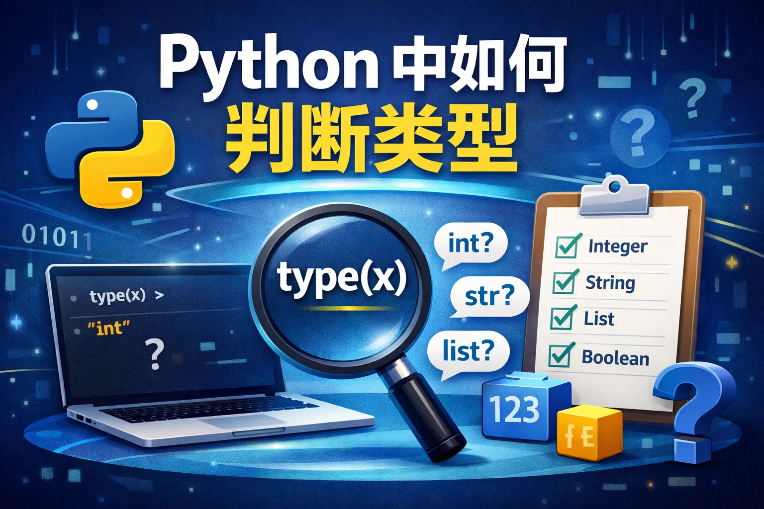 Python中可以使用type()函数来获取变量的类型,它返回变量所属的类。比如type(123)返回<class 'int'>。另外,isinstance()函数用来检测变量是否是某个特定类型或其子类的实例,例如isinstance(123, int)返回True。针对大多数场景,isinstance()更为推荐,因为它支持继承判断。