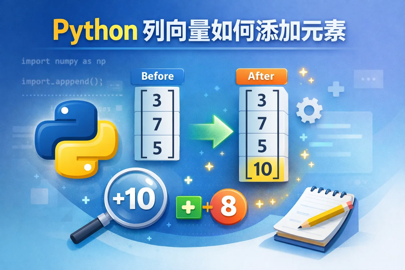 可以利用NumPy的vstack或append函数增加新元素,比如使用np.vstack((original_vector, new_element)),确保新元素的形状与列向量匹配。