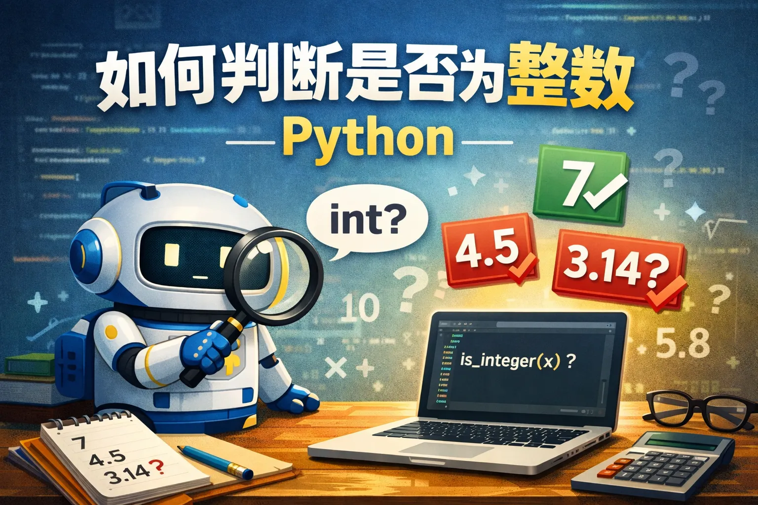 可以用 num.is_integer() 方法来判断浮点数是否等于它的整数形式。如果返回 True,说明这个浮点数看起来像一个整数,例如 3.0。示例: