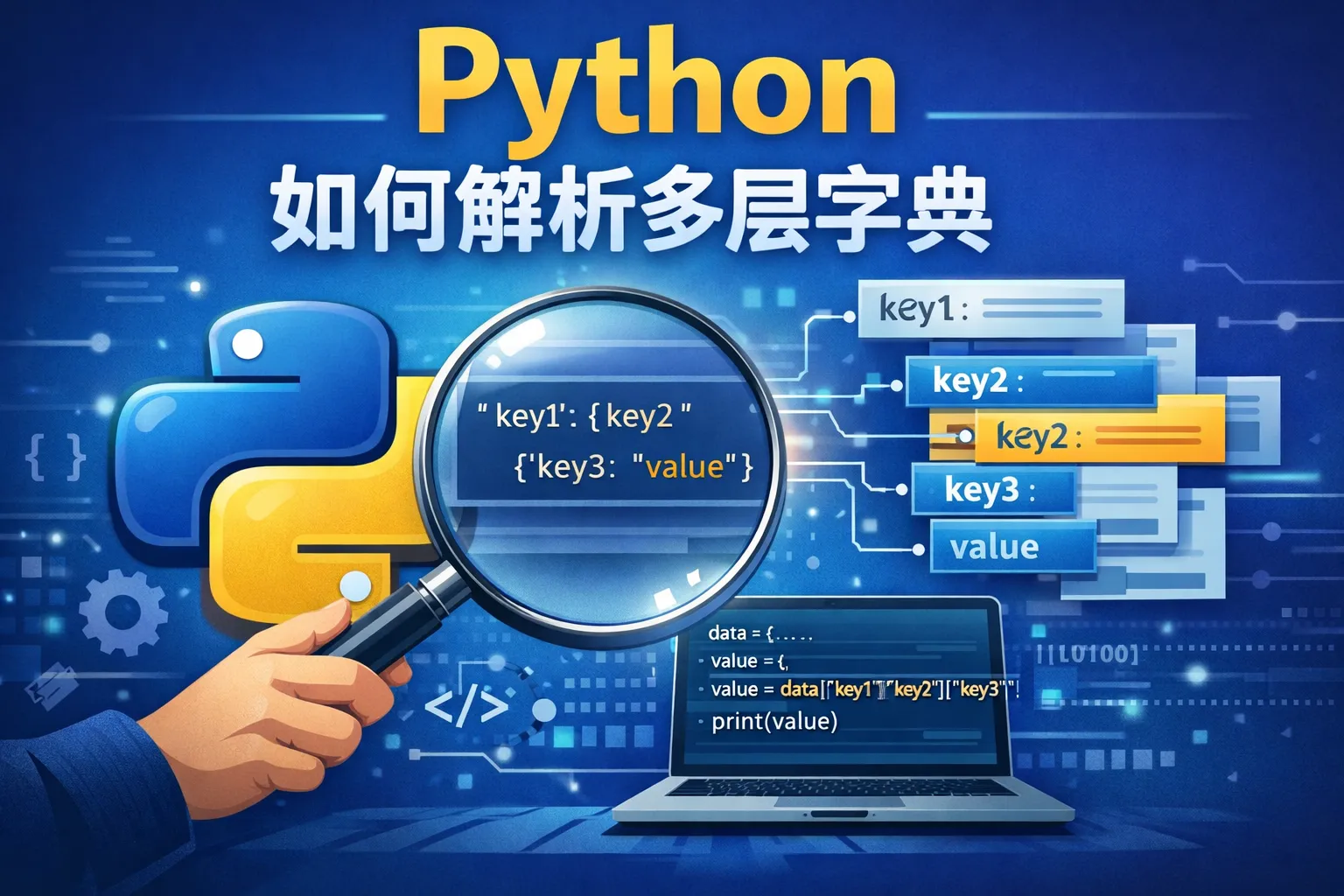 可以使用多次索引操作,例如 dict['key1']['key2'] 来访问内层字典的值。如果层级较深,建议分步骤赋值,或者使用递归函数遍历。