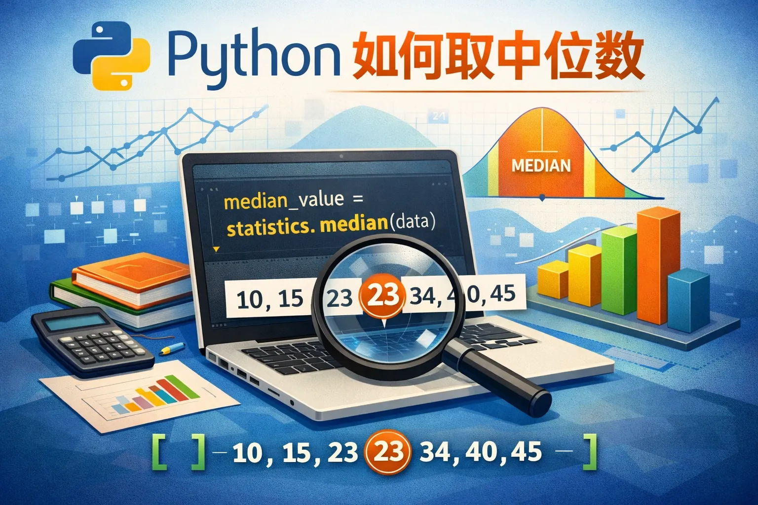 Python的statistics模块提供了median函数,可以直接计算中位数。只需导入模块,然后调用statistics.median(数据列表)即可。例如: