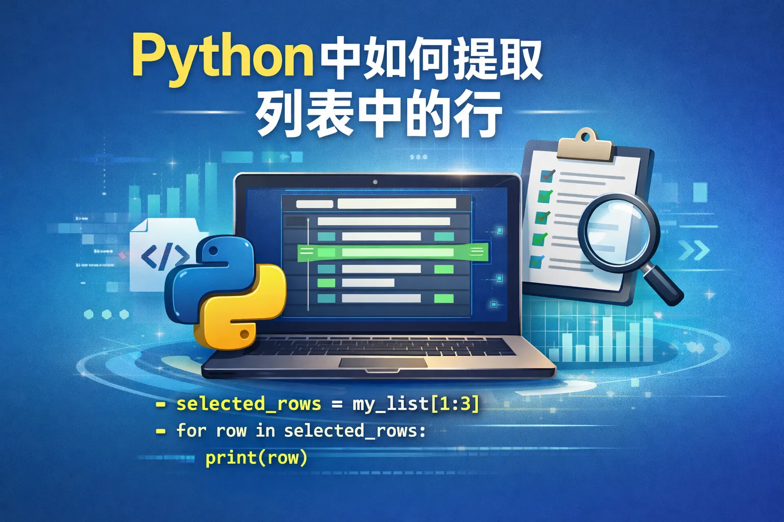 切片操作可以帮助提取连续的多行,比如 my_list[1:5] 会返回从第2行到第5行的数据组成的新列表。切片语法是 list[start:end],包含start索引,不包含end索引。