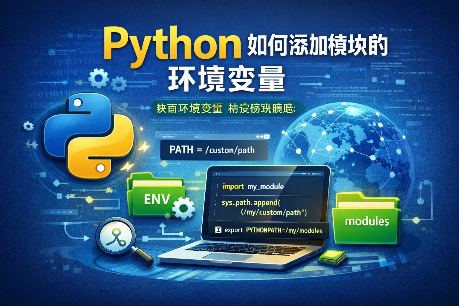 可以通过修改系统环境变量PYTHONPATH,将自定义模块所在的目录添加进去。这样,Python在导入模块时会搜索该目录。具体操作方法包括在操作系统中直接添加PYTHONPATH,或者在Python代码中使用sys.path.append('模块路径')临时添加路径。