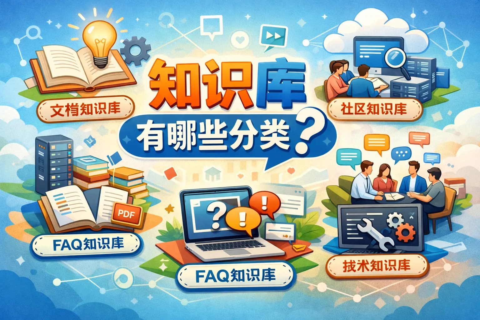 知识库一般分为文档型、问答型、流程型和数据型四大类。文档型以文字资料为主,适用于存储手册和指南;问答型侧重解决用户常见问题;流程型用于记录操作步骤和规范;数据型则包含结构化信息,如统计数据和数据库内容。