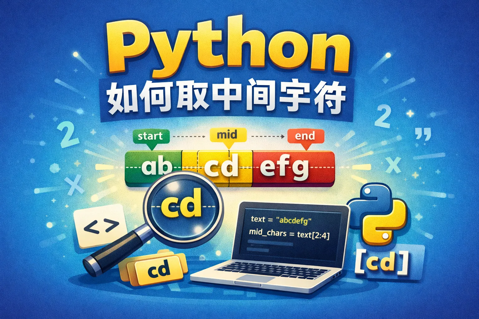 先计算字符串的中间位置mid = len(s)//2,然后用切片s[mid-n:mid+n+1]取出中心字符及其左右n个字符,其中n代表你想取几个字符的范围。要注意索引边界,防止越界。