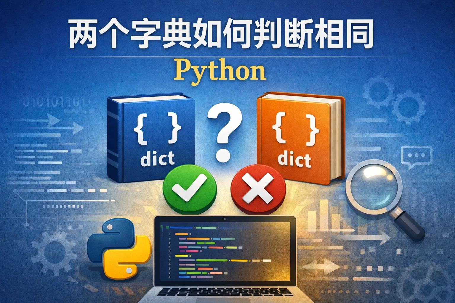 可以通过比较两个字典的键集合(例如使用dict1.keys() == dict2.keys())来判断键是否相同。若要比较键值对完全一致,则使用 == 运算符。
