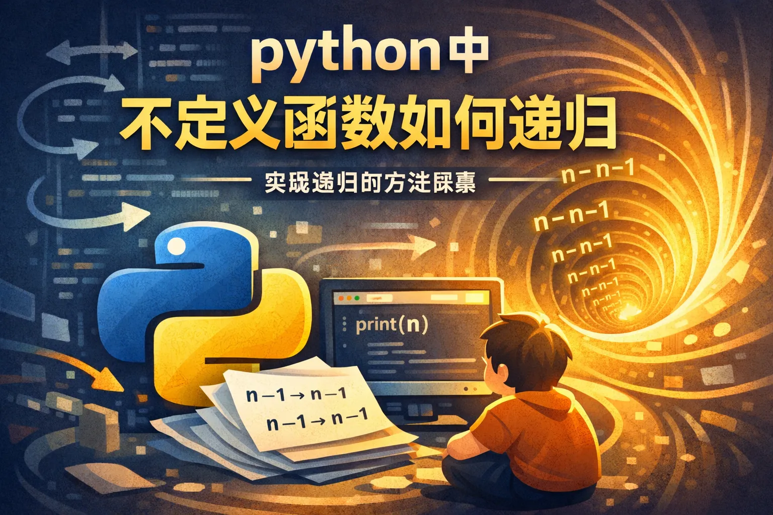 Python语法设计中,递归依赖函数自调用。不定义函数实现递归会导致代码难以理解、维护困难,而且可行的方法往往涉及复杂的技术手段,性能和调试体验也较差,因此不推荐这种做法。