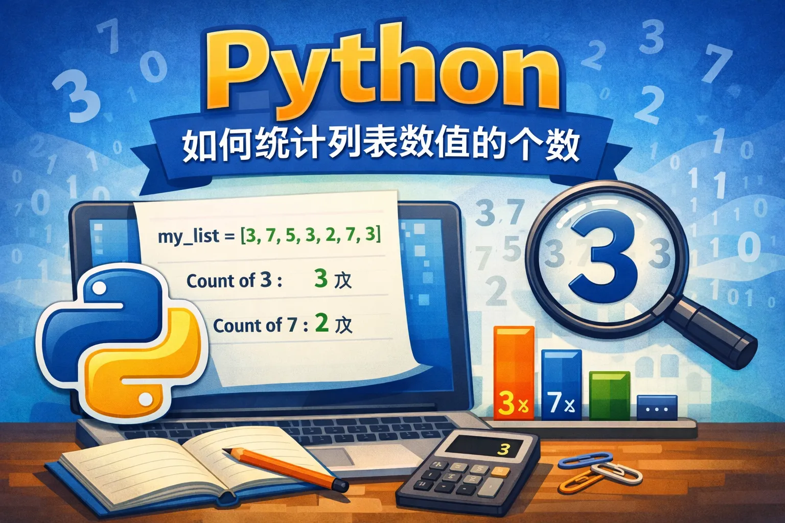 Python列表对象自带count()方法,可以直接统计某个元素在列表中出现的次数。示例:nums = [1, 2, 2, 3, 2],统计数字2的个数是nums.count(2),结果为3。