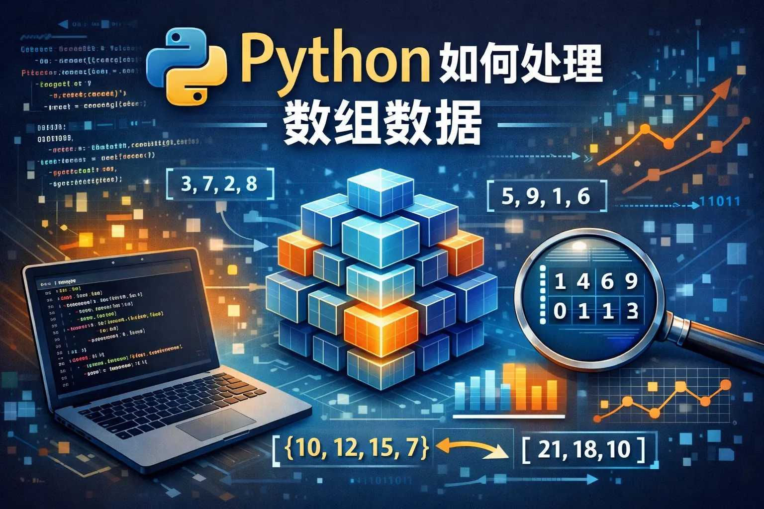 Python中常使用列表(list)来处理数组数据,常用操作包括添加元素(append)、删除元素(remove、pop)、切片(slice)、排序(sort、sorted)以及遍历等。此外,还可以利用NumPy库提供的数组对象,它支持更多高效的数组操作,如矩阵乘法、广播、维度变换等。
