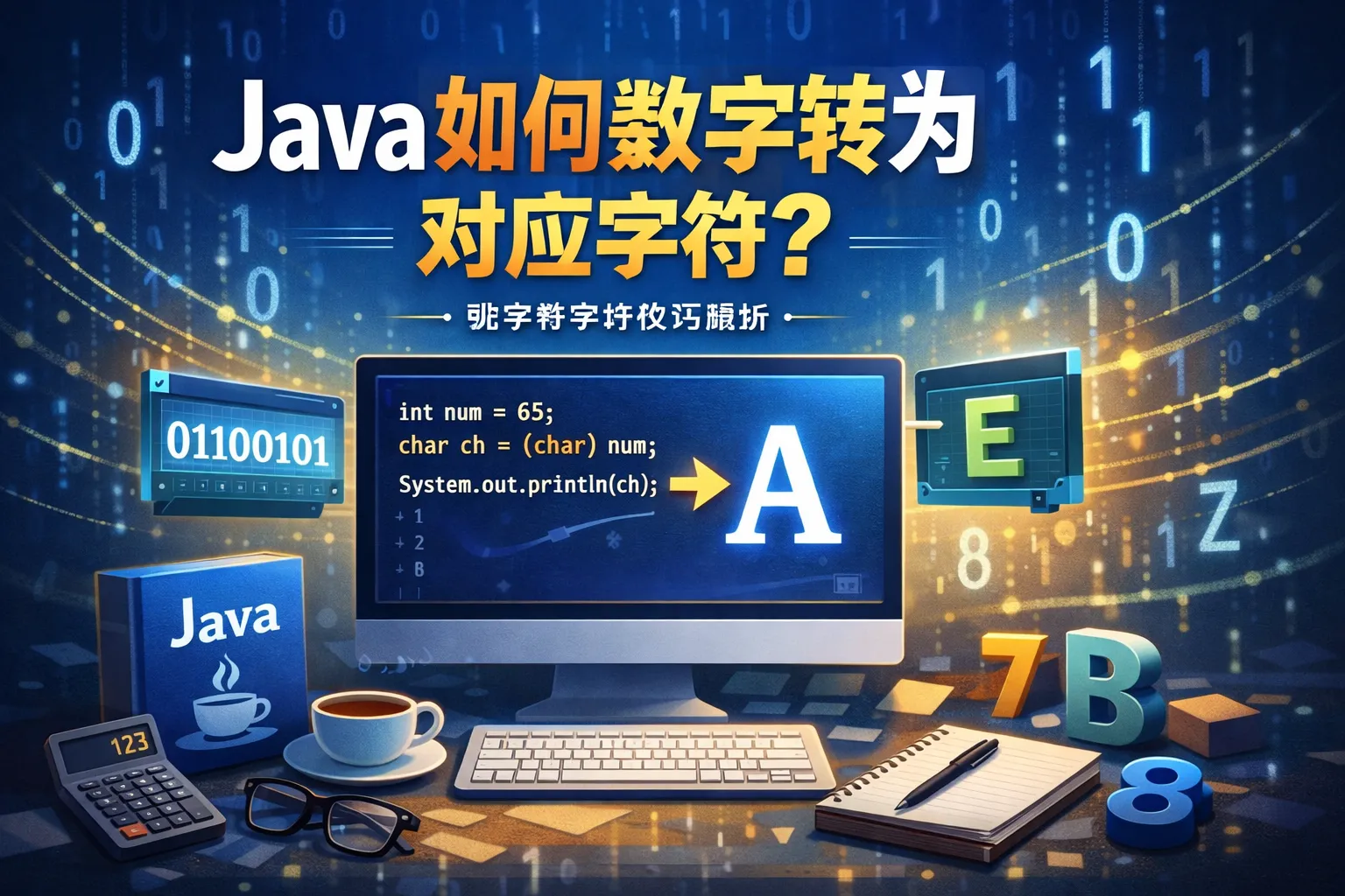 在Java中,可以通过将数字强制转换为char类型来实现数字到字符的转换。例如,int num = 65; char ch = (char) num; 这样ch的值就是对应的字符'A'。需要注意的是,转换的数字需要在字符的有效范围内,否则会得到不可预期的字符。