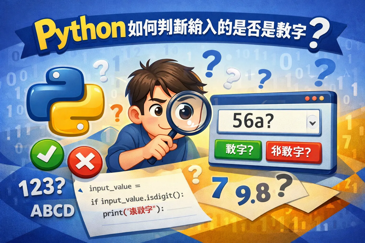 可以通过尝试将输入使用 int() 或 float() 函数进行转换,如果转换成功则说明输入是数字,否则捕获异常并判断。示例代码如下: