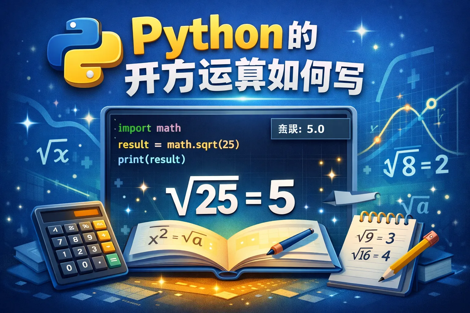 可以导入math模块,使用math.sqrt()函数计算平方根,例如:import math; math.sqrt(9)返回3。此外,也可以使用指数运算符,例如:9 0.5,得到的结果也是3。
