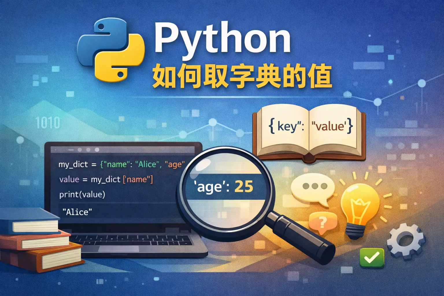 可以通过字典名加上中括号括住的键,比如dict_name[key],来获得对应的值。如果键不存在,会引发KeyError。