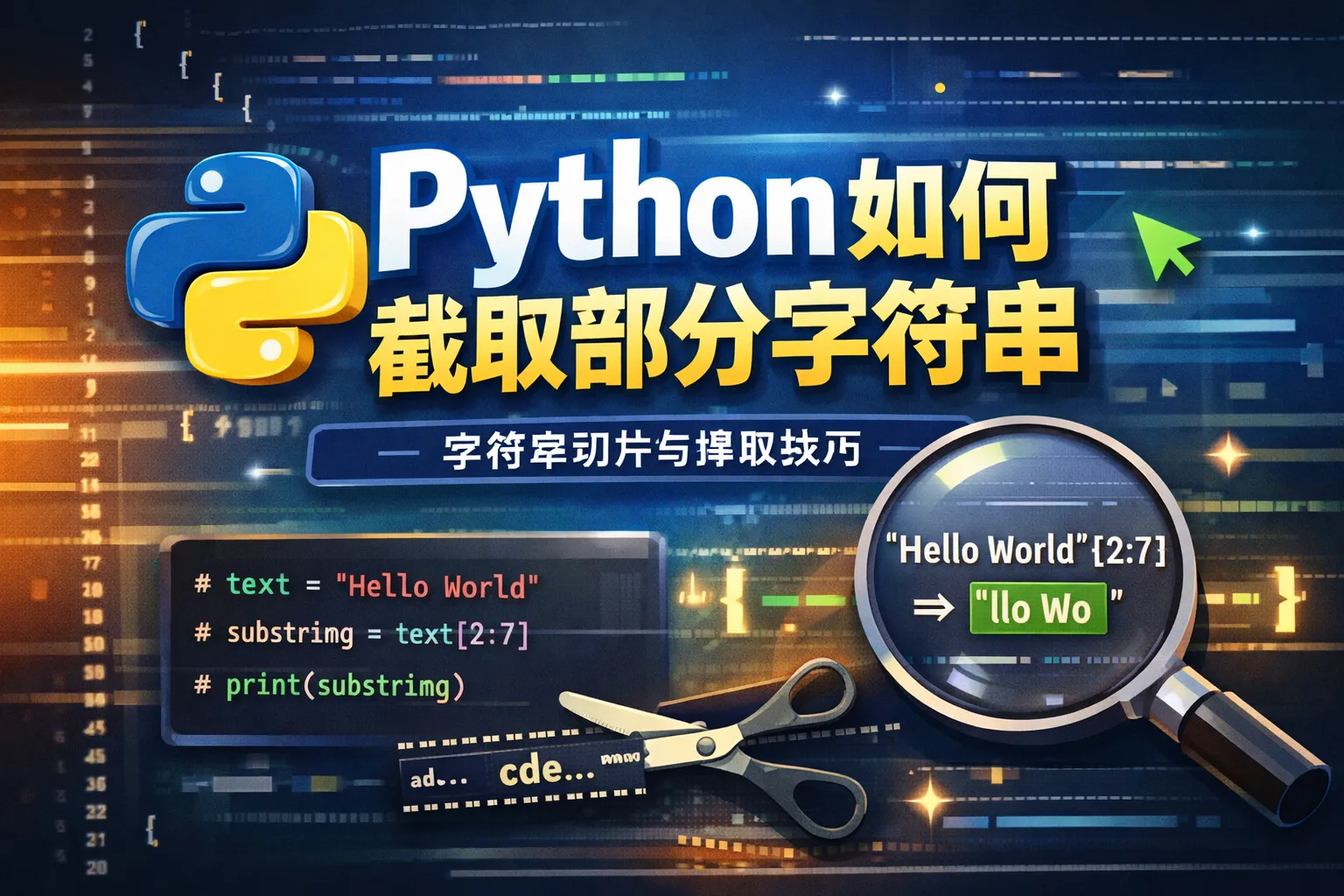 Python主要使用切片(slice)来截取字符串,例如str[start:end]可以提取从start索引到end索引之前的部分。另外,还可以使用字符串的find()方法结合切片来定位和提取特定子串,或者利用正则表达式通过re模块进行复杂匹配和提取。