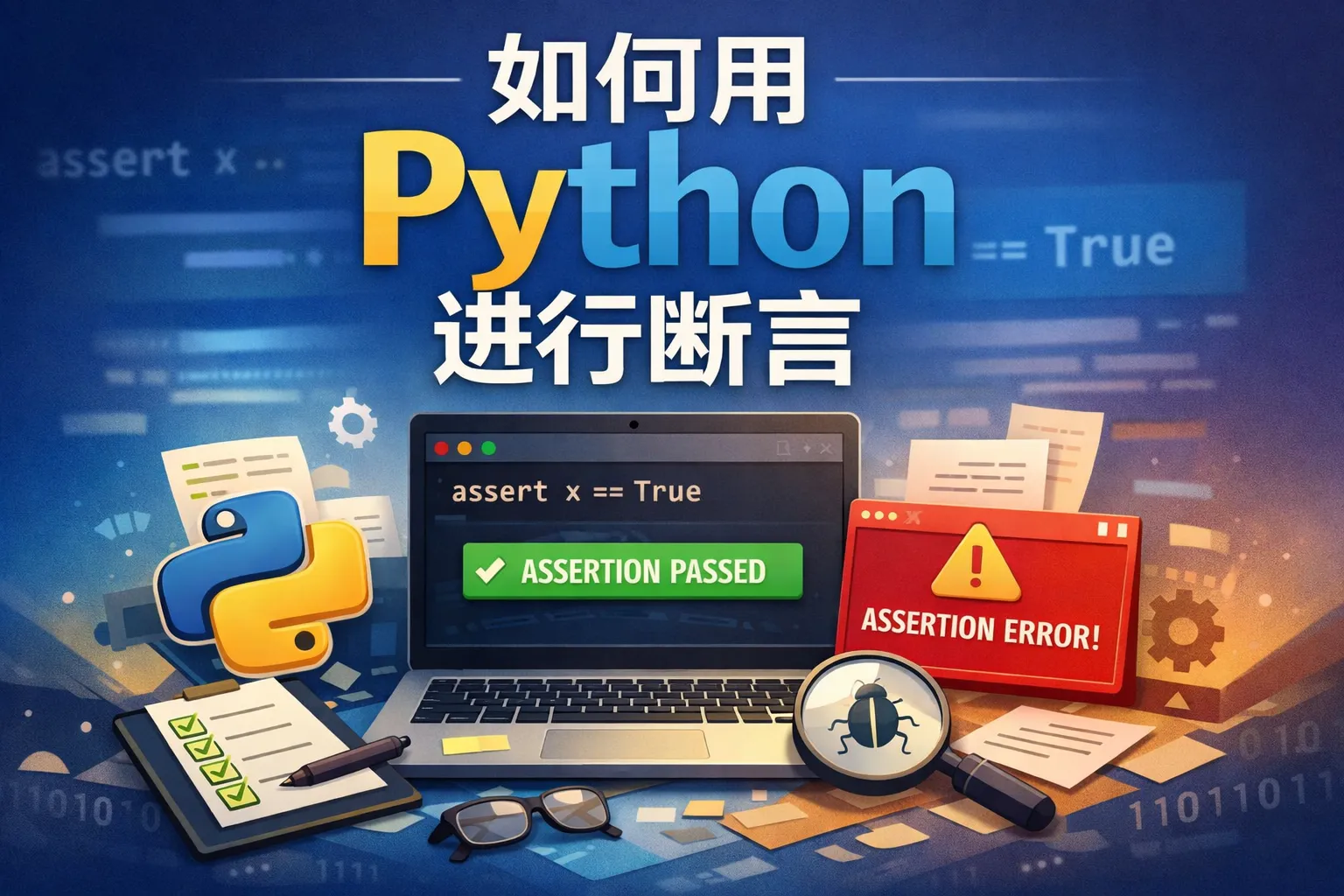 Python中的断言用assert关键字,语法格式是assert condition, message,当condition为False时,会触发AssertionError并显示可选的message。例如:assert x > 0, 'x必须大于0'。