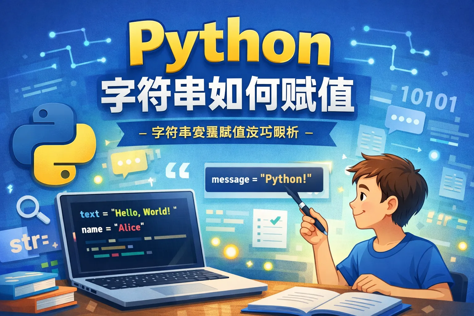 在Python里,可以通过将字符串内容放在引号内(单引号或双引号均可)赋值给变量,例如:name = 'Alice' 或者 name = "Alice"。除此之外,三引号用于定义多行字符串,例如:text = '''多行文本'''。