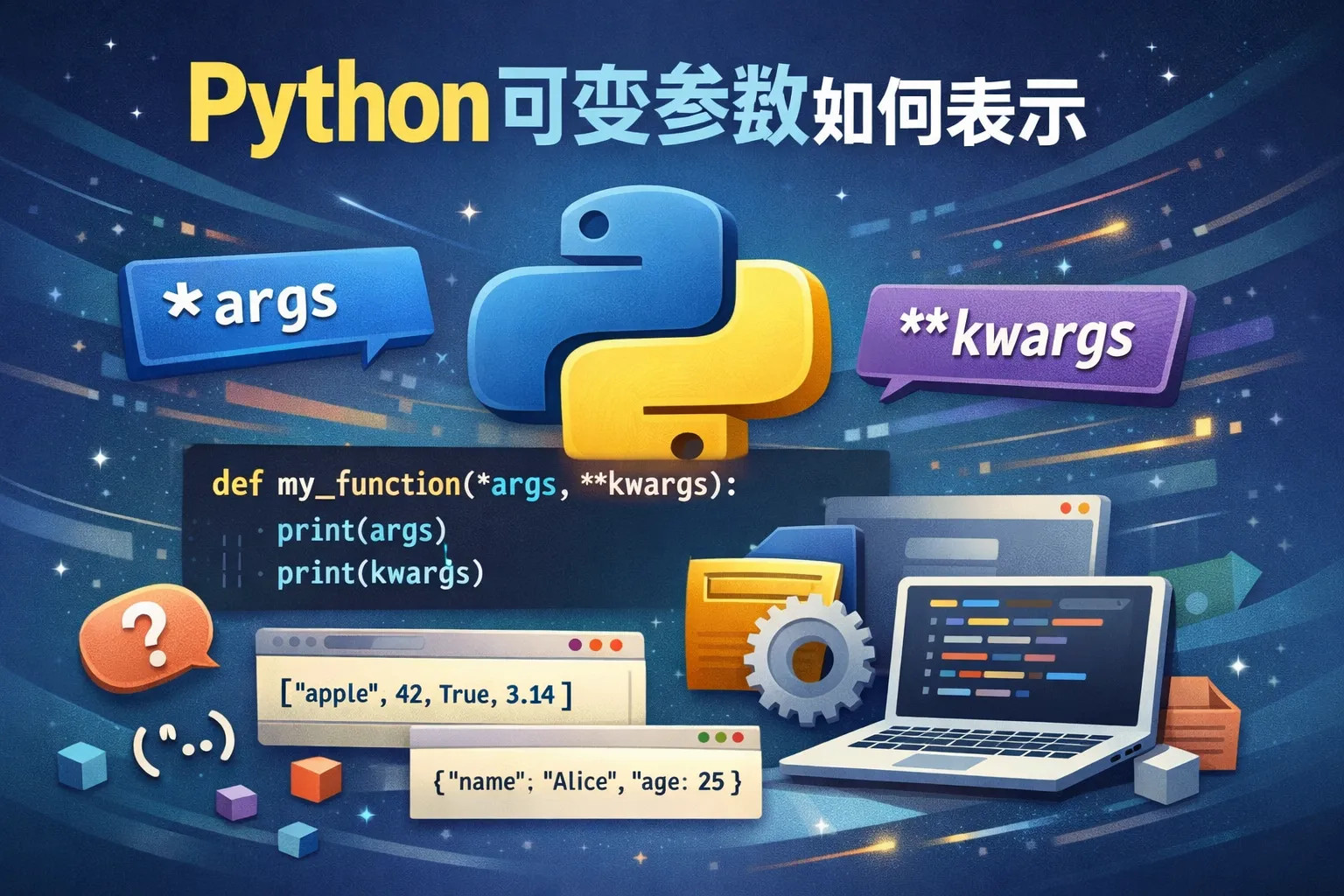 在Python中,可以通过在函数定义时使用星号(*)来表示可变位置参数,比如def func(*args):,这样函数调用时可以传入任意数量的位置参数。此外,双星号()用于表示可变关键字参数,如def func(kwargs):,用来接收任意数量的键值对参数。