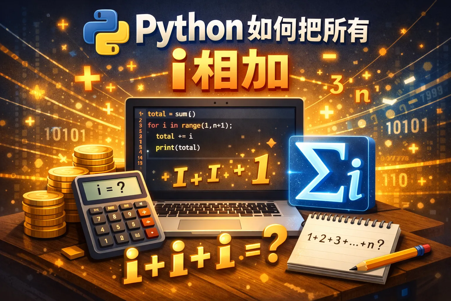 可以创建一个累加器变量(如total = 0),然后在循环中使用total += i将i的值逐次累加到total上,循环结束后total即为所有i的总和。