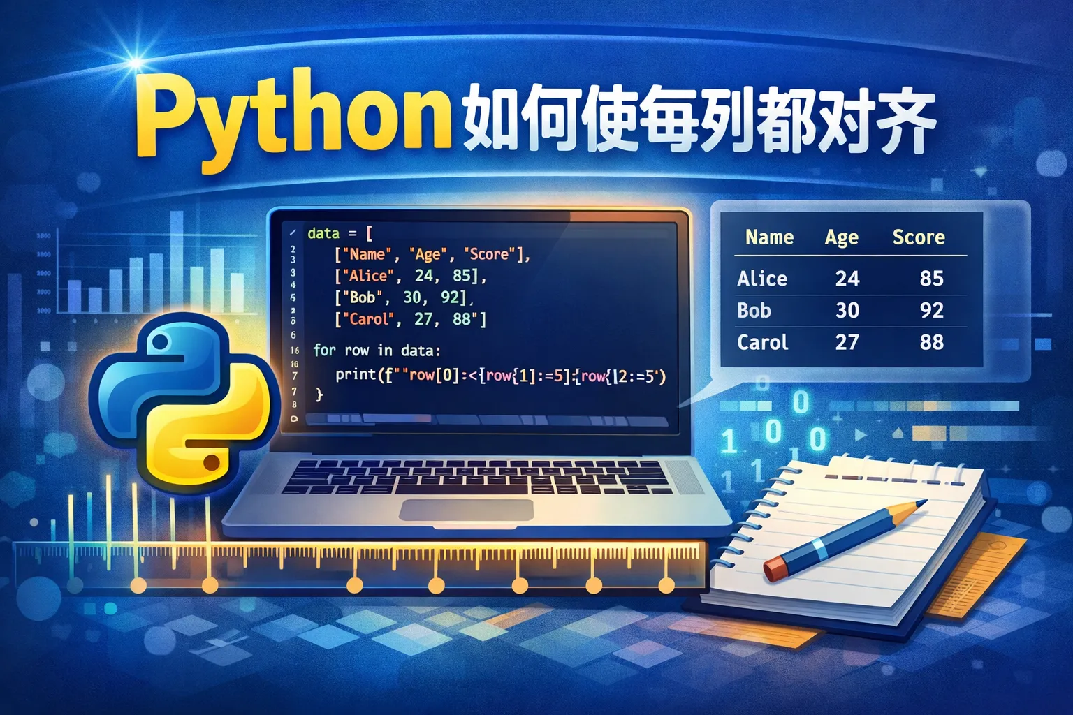 Python中可以使用格式化字符串(如format方法或f-string)来设定每列的固定宽度,从而实现对齐效果。此外,模块如csv和pandas也提供了一些方法来处理表格对齐。通过制定宽度和对齐方式(左对齐、右对齐或居中),可以使数据以整齐的样式进行输出。