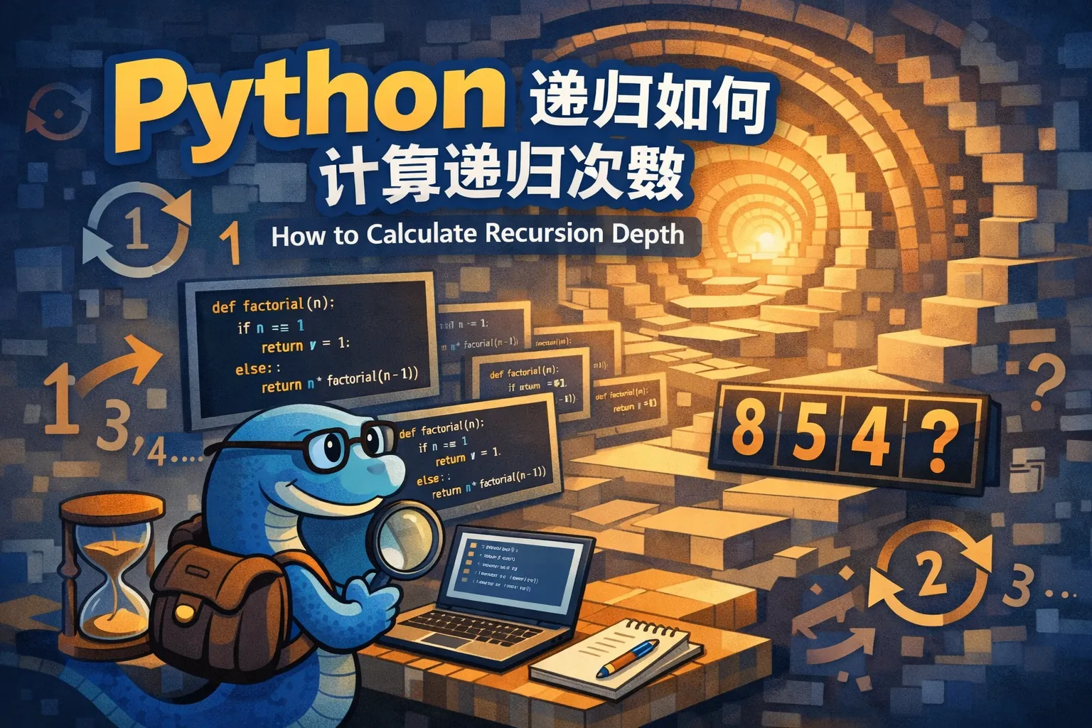 Python的sys模块中有一个sys.getrecursionlimit()函数可查看最大递归深度限制。为了计算实际的递归调用深度,可以在递归过程中维护一个深度计数器,随着递归深入递增,递归返回时递减。这样就能知道当前递归层级有多少层。