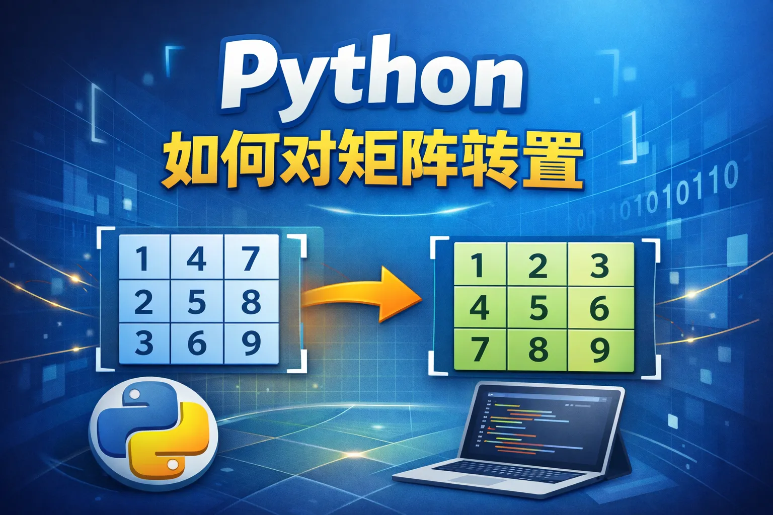 Python中可以使用多种方法对矩阵进行转置操作,例如利用NumPy库的transpose()函数或者.T属性直接进行转置;如果不使用外部库,也可以借助列表解析来手动实现矩阵转置。